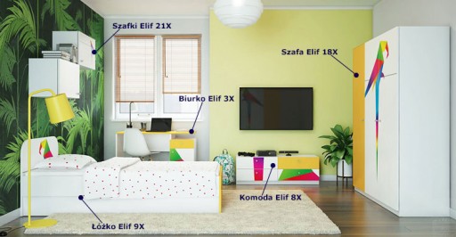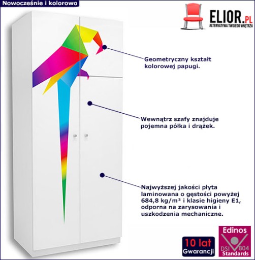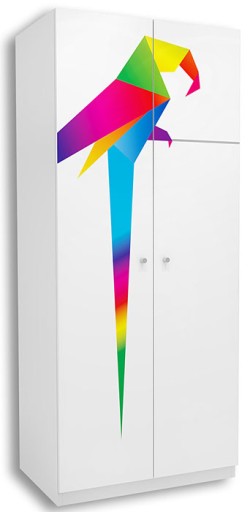 Dzieci uwielbiają wzory i kolory. W estetycznie urządzonym wnętrzu miło się odpoczywa, bawi i uczy. Komplet mebli Elif to wyjątkowa kolekcja dedykowana najmłodszym fanom dobrego designu. Jednym z jej elementów jest szafa Elif 19X, obok której żadne dziecko nie przejdzie obojętnie. Fronty szafy ozdobiliśmy geometryczną papugą, która stanowi wspaniałą ozdobę mebla. Kolorowa papuga nada każdemu wnętrzu unikalnego charakteru. Jesteśmy pewni, że do pokoju Twojej pociechy już nigdy nie wkradnie się nuda. Grafikę nanieśliśmy za pomocą nowoczesnej hybrydowej drukarki UV, dzięki czemu nadruk jest trwały, odporny na ścieranie i niezwykle atrakcyjny wizualnie. Korpus i fronty szafy Elif 19X wykonaliśmy w pasującym do każdego wnętrza białym kolorze. Biały to uniwersalny kolor, który spodoba się zarówno chłopcom, jak i dziewczynkom.