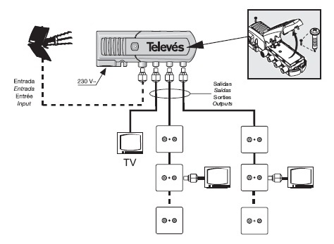 3-wyjściowy wzmacniacz domowy (2+TV) do rozszerzenia domowej sieci TV naziemnej.Wyjście TV posiada mniejsze wzmocnienie do bezpośredniego połączenia z telewizorem (bez instalacji gniazda).