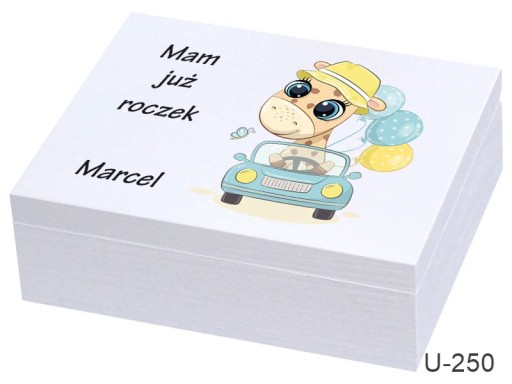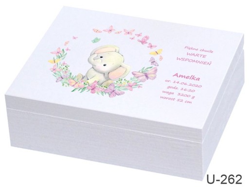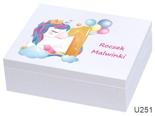 Drewniane pudełko z zewnątrz malowane na biało wieko z kolorowym nadrukiem bezpośrednio na pudełku , personalizacja IMIĘ