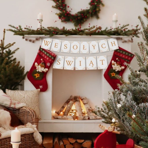 Baner świąteczny w biało-złotej kolorystyce z napisem Wesołych Świąt to sposób na ozdobę bożonarodzeniową pomieszczenia. Baner składa się z pojedynczych literek, które należy zawiesić na wstążce. Baner pięknie będzie wyglądał nad stołem lub przy choince.