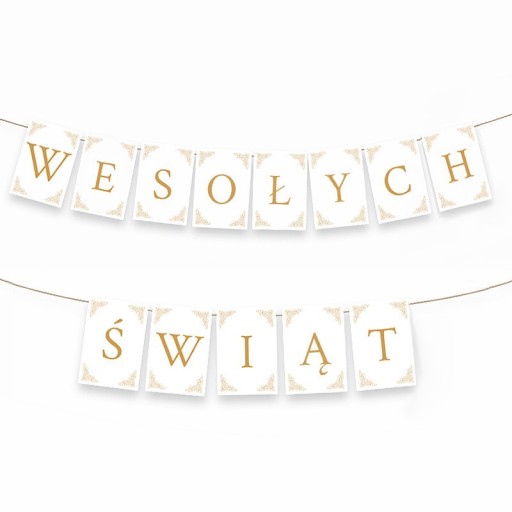 - skład: baner świąteczny z literek w biało-złotej kolorystyce, który należy zamocować na wstążce - dokup ją osobno