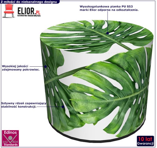 Zapewne zgodzisz się z nami, że doskonały wygląd to nie wszystko. Bo przecież co nam z mebla, który za chwilę straci swój urok? Właśnie dlatego projektanci marki Elior dołożyli wszelkich starań, aby pufa Adelos 5X wyróżniała się wysoką jakością. Dzięki temu starannie wyselekcjonowane materiały oraz precyzyjna praca specjalistów zapewni Ci zadowolenie z pufy przez długi czas. Wzory nadrukowane zostały na wysokogatunkowym filcu poliestrowym. Jest to tkanina niezwykle odporna na rozerwania oraz przecieranie. Nie gniecie się, jest lekka i elastyczna, a co najważniejsze nie zniekształca się nawet po praniu. Zdejmowane pokrowce zdecydowanie podnoszą komfort użytkowania mebla - można je prać. Pod pokrowcem znajdują się dwie warstwy pianki PU S53 - niezwykle odpornej na działanie grzybów i pleśni. Jest to pianka, która "nie starzeje się" co oznacza, że pomimo upływających lat nie zmienia swoich parametrów. Dodatkowo jest elastyczna i odporna na odkształcenia. Sztywny rdzeń znajdujący się u boku pianki utrzymuje całość nadając pufie solidnej stabilności. Całość wykonana pod okiem najlepszych specjalistów zaskakuje niesamowitą jakością zapewniającą korzystanie z mebla bez uszkodzeń przez wiele lat. Podejmij mądrą decyzję wybierając wspaniale dopracowana pufę Adelos 5X i spraw by twoje wnętrze zaskoczyło swoim designem absolutnie każdego kto się w nim pojawi!