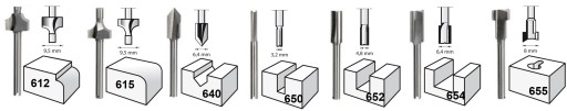 - Do frezowania zarysów płaskich, inkrustacji oraz dłutowania w drewnie i innych miękkich materiałach. Należy je stosować z frezarką górnowrzecionową Dremel (335) lub frezarką dolnowrzecionową (231).