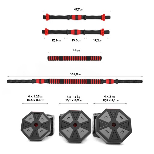 W skład zestawu wchodzą dwa gryfy, cztery zaciski, łączenie dwóch gryfów i łącznie 12 talerzy obciążeniowych.