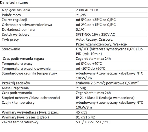 - Możliwość współpracy z czujnikami NTC różnych producentów