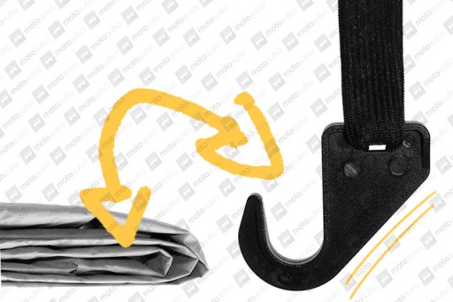 Pokrowiec mocowany jest za pomocą gumek zakończonych plastikowymi haczykami, które należy zaczepić o felgi lub kołpaki w samochodzie.