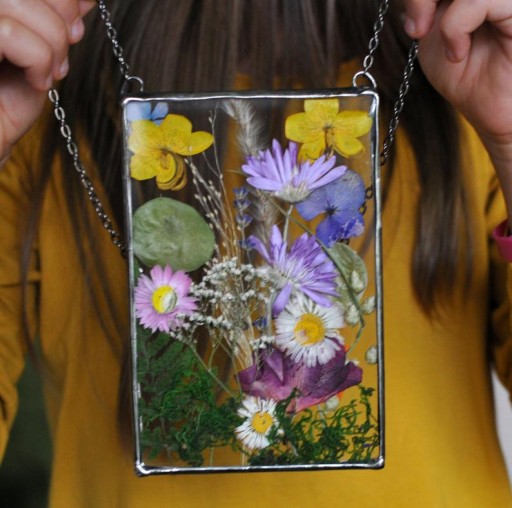 Dekoracyjny witraż z kompozycją z suszonych roślin wykonany w całości w pracowni rękodzieła MARIAELA.
