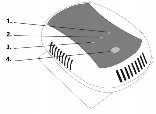- Urządzenie posiada układ auto-diagnostyczny, który w momencie wykrycia awarii czujnika powoduje uruchomienie sygnału dźwiękowego oraz miganie żółtej diody. Awaria urządzenia oznacza konieczność skontaktowania się z serwisem lub wymianę urządzenia ze względu na koniec żywotności detektora.