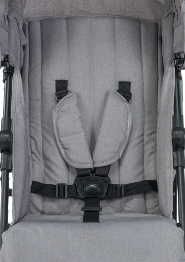 Posiada regulowane oparcie i osłonę przeciwsłoneczną.
