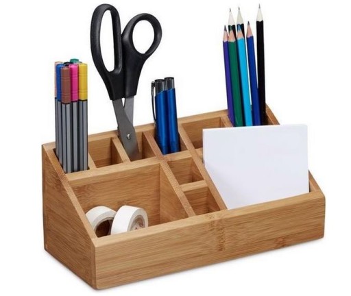 Organizer z 10-stoma przegródkami. Idealny do przechowywania drobnych kosmetyków do makijażu: szminek, tuszy do rzęs, lakierów, kredek do oczu, konturówek do ust, pędzelków oraz przyborów. Dzięki temu Twoje kosmetyki będą zawsze uporządkowane i w zasięgu ręki. Może również znaleźć zastosowanie jako organizer do uporządkowania akcesoriów biurowych. Wykonany z wysokiej jakości drewna bambusowego.