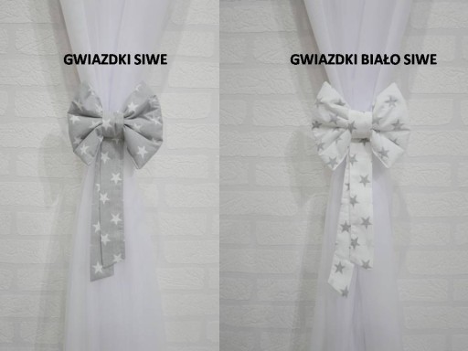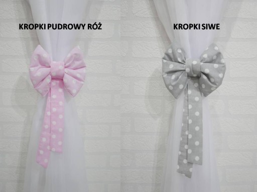Każda kokarda posiada dodatkowe wiązanie w kolorze kokardy w celu upięcia na firanę lub zasłonę ( możne je oczywiście usunąć i zapiąć kokardę np. na agrafkę w dowolnym miejscu )