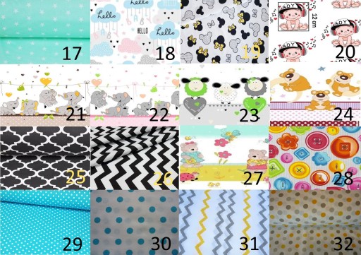 12.Kolorowe piłki 13.Misie teddy 14.Auta II 15.Auta paski 16.Piłki na zielonym 17.Gwiazdka na mięcie 18.chmurki 19.Myszka Miki