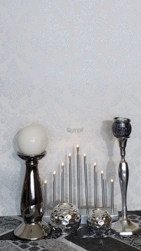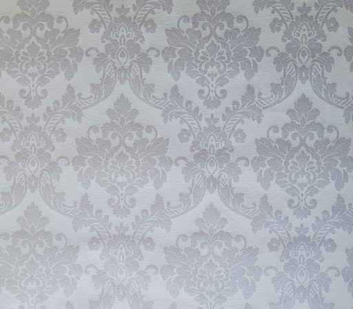 Klasyczna tapeta w stylu glamour. Idealnie pasować będzie nie tylko do salonu lub sypialni, ale także do kuchni oraz jadalni. Struktura tapety gładka ze srebrnymi brokatowymi ornamentami.