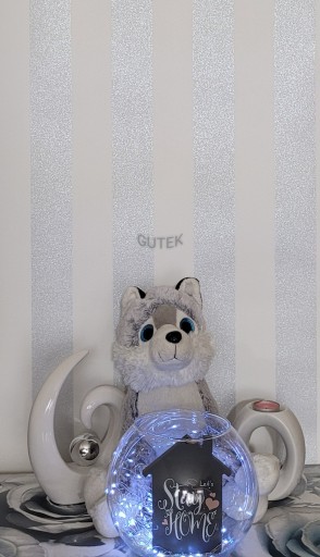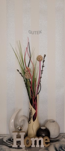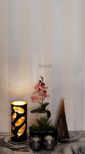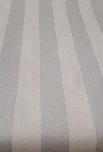 Modna tapeta w pasy. Idealnie pasować będzie nie tylko do salonu lub sypialni, ale także do kuchni oraz jadalni. Struktura tapety gładka w biało srebrne brokatowe pasy.