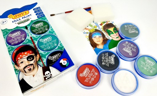 Farba do twarzy JOVI w postaci kremu, na bazie oleju, co w dużej mierze zapobiega jej wysychaniu i sprawia, że jest łatwa w użyciu, i nie wymaga stosowania wody. Dobrze kryje i jednocześnie jest łatwa do usunięcia, wystarczy wilgotna ściereczka lub woda z mydłem. Farba do twarzy nie zawiera parabenów i jest hipoalergiczna.Odpowiednia dla Dzieci od 3 lat.Opakowanie zawiera 6 poj. po 8ml, 2 gąbki, pędzelek i instrukcja malowani
