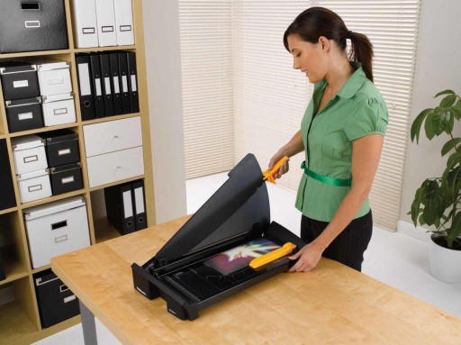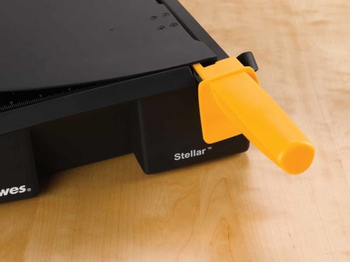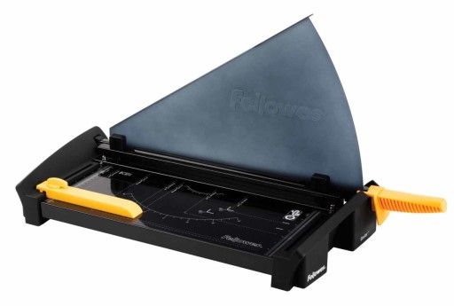 - Łatwe przechowywanie i transport. Osłona SafeCut™ może być złożona na płasko na podstawie, oszczędzając miejsce. Gilotyna może być ustawiona pionowo na półce.