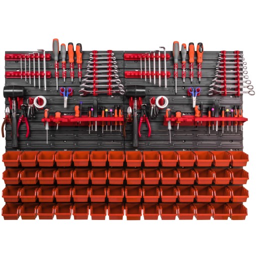 - Uchwyt 2: 8 uchwyty na klucze (4 pionowe i 4 poziome) , 16 uchwytów na śrubokręty, drobne narzędzia , 8 wieszaki 5,5 cm , 8 wieszaki 3,5 cm.