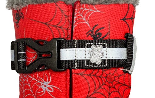 Śniegowce dziecięce zapinane na klamerkę w kolorze czerwonym. Dolna część kozaczków jest wykonana z wodoodpornego PVC. Cholewka uszyta jest z impregnowanej tkaniny poliestrowej. Ocieplane futerkiem z domieszką naturalnej wełny.