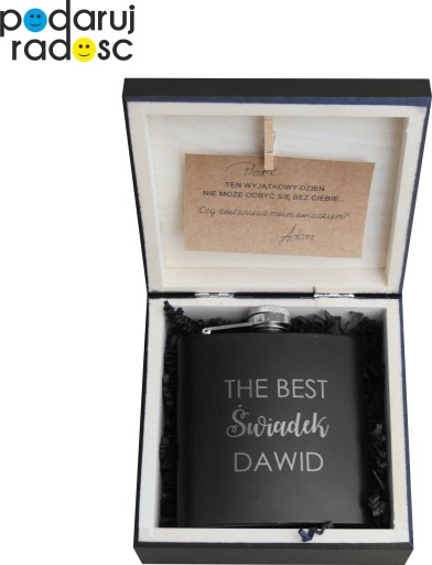 - czarną piersiówkę z grawerem,, The Best Świadek '' + imię