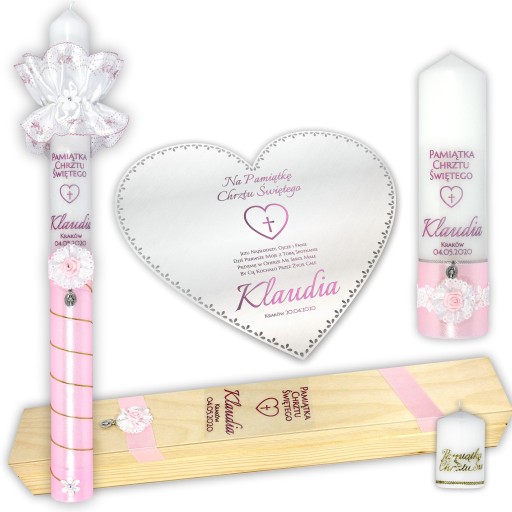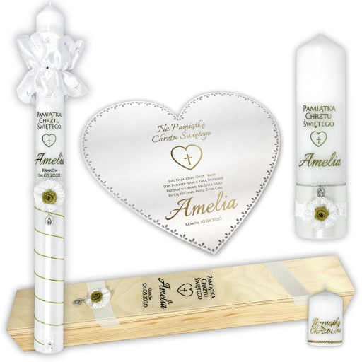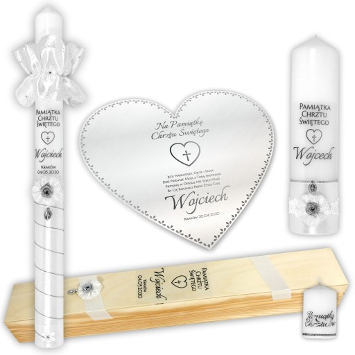 ZESTAW PUDEŁKO DREW ŚWIECA I SZATKA DO CHRZTU ŚWIECA STOŁOWA + MAŁA ŚWIECZUSZKA W PREZENCIE