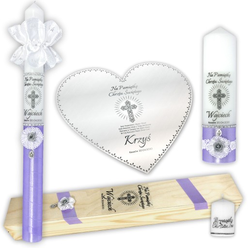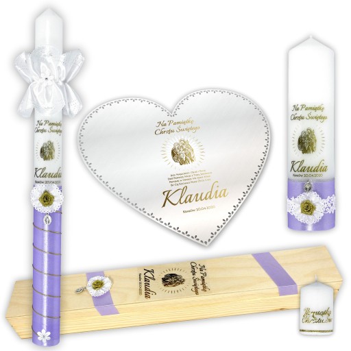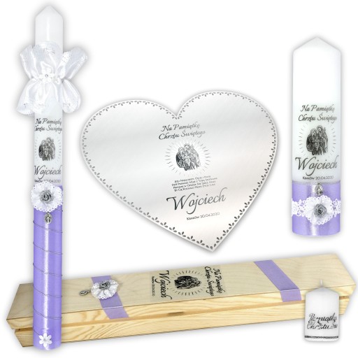 Bardzo delikatny zestaw. Świeca przyozdobiona fioletową satyną ze srebrnym akcentem, wykończona u dołu białym kwiatkiem. Głównym motywem jest srebrny obrazek Świętej Rodziny. Całość dopełnia srebrna, brokatowa różyczka
