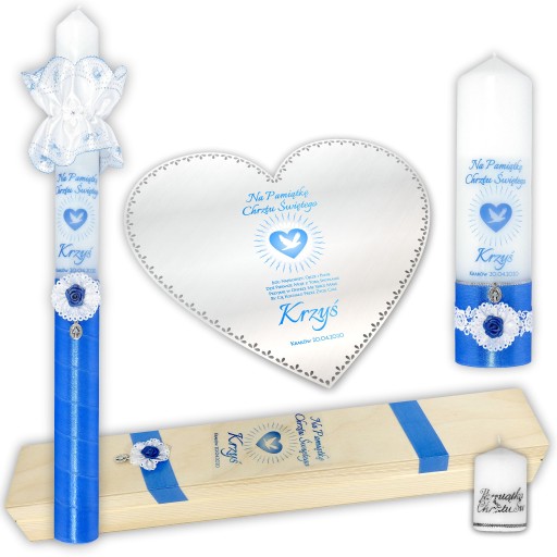 Świeca stylizowana na kolor niebieski, przyozdobiona błękitną satyną ze srebrnym akcentem, wykończona u dołu białym kwiatkiem. Niebieskie obszycie profitki wspaniale komponuje się z rozetą przyozdobioną niebieską różyczką oraz napisami i obrazkiem serduszka.