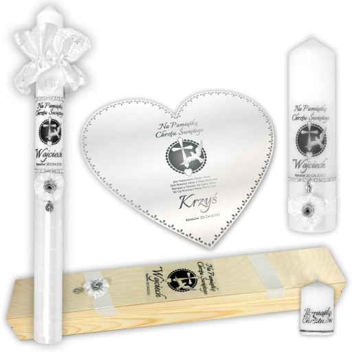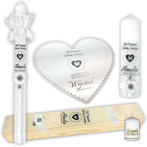 Bardzo delikatny i uniwersalny zestaw dla chłopców oraz dziewczynek. Delikatności świecy nadaje połączenie białej profitki i satyny wraz ze srebrną, brokatową różyczką oraz srebrne napisy. Całości dopełnia świetnie komponujący się medalik w kolorze srebra.