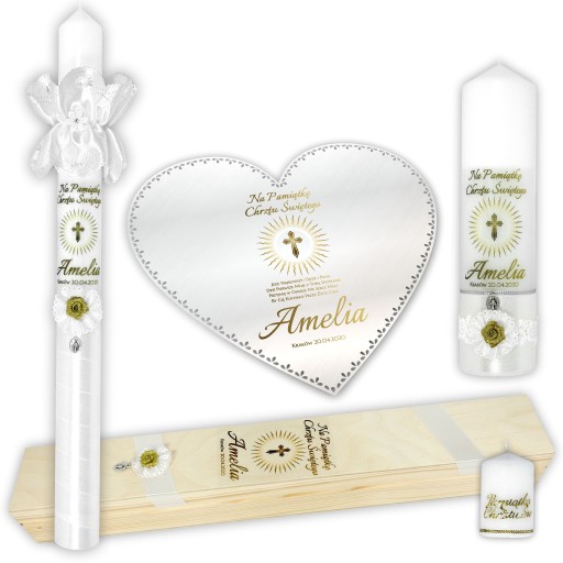Świeca zarówno dla chłopców jak i dziewczynek, przyozdobiona białą satyną ze złotym akcentem, wykończona u dołu białym kwiatkiem. Zestaw podkreślony jest przez rozetę z piękną złotą różyczką, złote napisy z serduszkiem oraz profitkę.