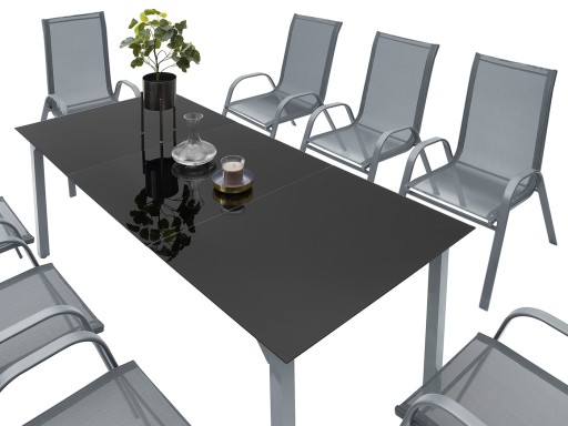 ZESTAW MEBLI OGRODOWYCH idealny do Twojego ogrodu. Stelaż został podwójnie lakierowany proszkowo, co idealnie przystosowuje ten produkt to zastosowania wewnątrz jak i na zewnątrz. Siedzisko krzesła oraz oparcie zostało zrobione z szarego, elastycznego obicia tekstylnego tak, aby maksymalnie zwiększyć wygodę. Posiada ono dwa oparcia boczne. Użyte materiały nie wymagają częstej konserwacji, są odporne na warunki pogodowe i nie wymagają specjalnych środków do pielęgnacji. Nóżki są dodatkowo zaopatrzone w nakładki z tworzywa sztucznego. Stół posiada blat z czarnej hartowanej szyby o gr. 5 mm.