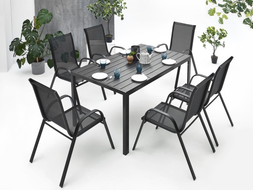 Konstrukcję stołu stanowi wysokiej jakości aluminium, malowane metodą proszkową. W oferowanym zestawie blat stołu wykonany jest z nieabsorbujących wody desek kompozytowych WPC, używanych między innymi do produkcji nowoczesnych systemów tarasowych i elewacji. Najważniejszym elementem konstrukcyjnym stołu są 4 profile aluminiowe w kształcie litery „U”. Ich zastosowanie sprawia, że po zmontowaniu całości stół jest wyjątkowo stabilny! Takie rozwiązanie pozwoliło na uzyskanie wolnej przestrzeni pod stołem i uniknąć niepotrzebnych dodatkowych konstrukcji przeszkadzających w wygodnym korzystaniu z mebli.