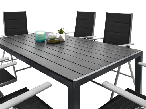Konstrukcję stołu oraz krzeseł stanowi wysokiej jakości aluminium, malowane metodą proszkową. W oferowanym zestawie blat stołu wykonany jest z nieabsorbujących wody desek kompozytowych WPC, używanych między innymi do produkcji nowoczesnych systemów tarasowych i elewacji. Najważniejszym elementem konstrukcyjnym stołu są 4 profile aluminiowe w kształcie litery „U”. Ich zastosowanie sprawia, że po zmontowaniu całości stół jest wyjątkowo stabilny! Takie rozwiązanie pozwoliło na uzyskanie wolnej przestrzeni pod stołem i uniknąć niepotrzebnych dodatkowych konstrukcji przeszkadzających w wygodnym korzystaniu z mebli.