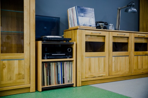 Trzy pozimowa szafka gramofonowa polskiego producenta ekspozytorów płyt winylowych z przeznaczeniem na gramofon i płyty.