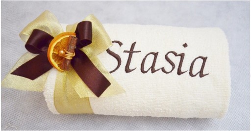 Całość tworzy piękny prezent - dekoracja dobierana jest do koloru haftu i ręczników. Możesz również sam wybrać kolor wstążki.