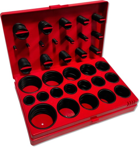 W zestawie znajduje się łącznie aż 419 szt. uszczelek w różnych rozmiarach, opakowane w solidną skrzynkę z tworzywa sztucznego, zamykaną na zasuwkę.