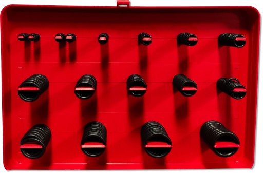 W zestawie znajduje się łącznie aż 382 szt. uszczelek w różnych rozmiarach, opakowane w solidną skrzynkę z tworzywa sztucznego, zamykaną na zatrzask.