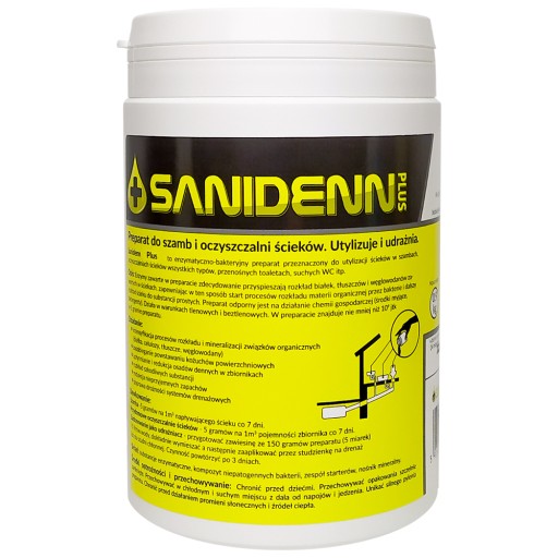 Sanidenn Plus to enzymatyczno-bakteryjny preparat przeznaczony do utylizacji ścieków w szambach, oczyszczalniach ścieków wszystkich typów, przenośnych toaletach, suchych WC itp.
