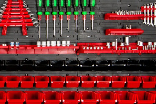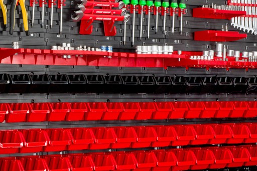- W zestawie 109 sztuk kuwet, zestaw uchwytów do narzędzi (w sumie 40 sztuk), 7 półek oraz 8 tablic ściennych 576 mm x 390 mm (po złączeniu 230 cm x 78 cm)