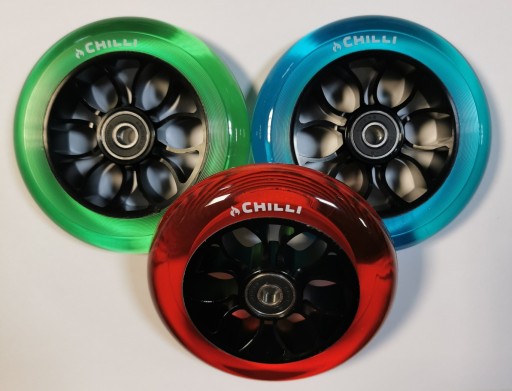 Chilli Wheels są dostępne w rozmiarach 100mm, 110mm, 120mm i specjalne 120mm Fat Wheels. Niezależnie od tego, czy są to hulajnogi wyczynowe dla dzieci, riderzy uliczni lub parkowi, początkujący czy profesjonaliści - każdy znajdzie odpowiednie koło. Wysokiej jakości rdzeń aluminiowy frezowany CNC i duże odbicie sprawiają, że kółko jest idealne. Wszystkie Chilli Wheels są wyposażone w dwa łożyska kulkowe ABEC9 i podkładkę. Wszystkie kółka są dostępne osobno - ale przy wymianie zalecamy wymianę obu ze względu na różnicę wysokości, gdy kóła są zużyte.