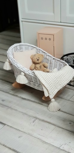 Przepiękna kołyska wiklinowa dla lalek, misiów. Kołyska w całości wykonana ręcznie z najwyższej jakości wikliny, pochodzącej z polskich gospodarstw.