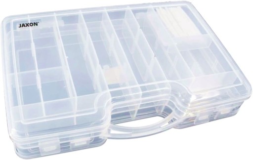 Duże dwustronne pudełko wykonane z polipropylenu, materiału nie wchodzącego w reakcję z przynętami sztucznymi. Posiada siedem stałych przegród po każdej stronie i przygotowane miejsca do własnej zabudowy.