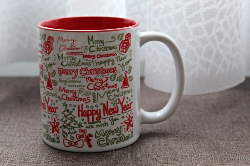 Kubek świąteczny ozdobiony w wzór świąteczny z czerwonym środkiem.