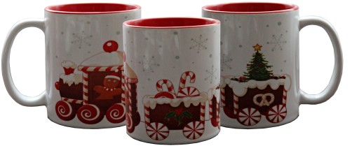 Kubek świąteczny ozdobiony w wzór świąteczny z czerwonym środkiem.
