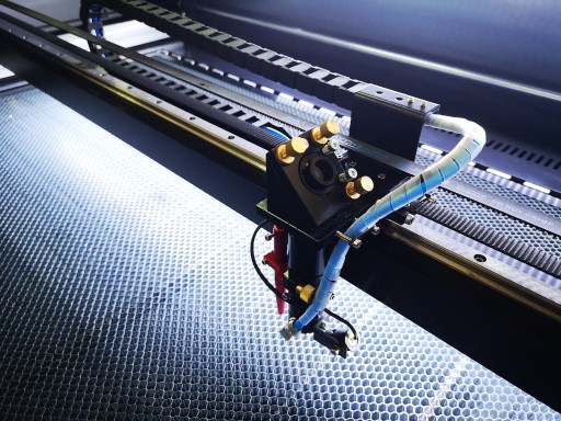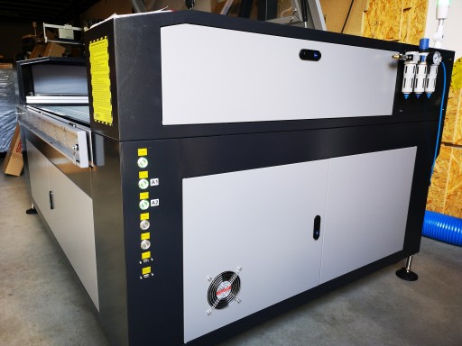 Maszyna standardowo wyposażona m.in. w przemysłową chłodnice wody S&A, system air assist, elektrycznie opuszczany stół, wyciąg spalin oraz czerwony punkt służący do lokalizacji miejsca cięcia.