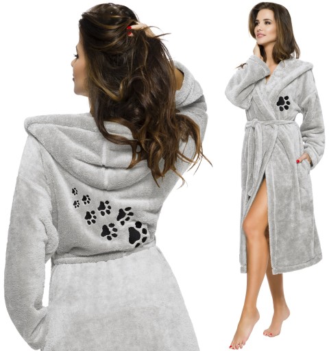 Dla miłośników zwierząt, szlafrok z haftem psiej łapki - na wysokości biustu i na plecach.