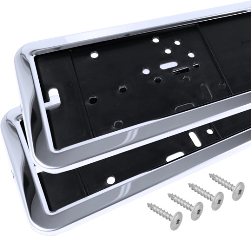 - Uniwersalna ramka na tablicę rejestracyjną. Składa się z dwóch części - czarnego spodu oraz metalowego przodu wykonanego ze stali nierdzewnej,
