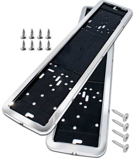 - Uniwersalna ramka na tablicę rejestracyjną. Składa się z dwóch części - czarnego spodu oraz metalowego przodu wykonanego ze stali nierdzewnej,