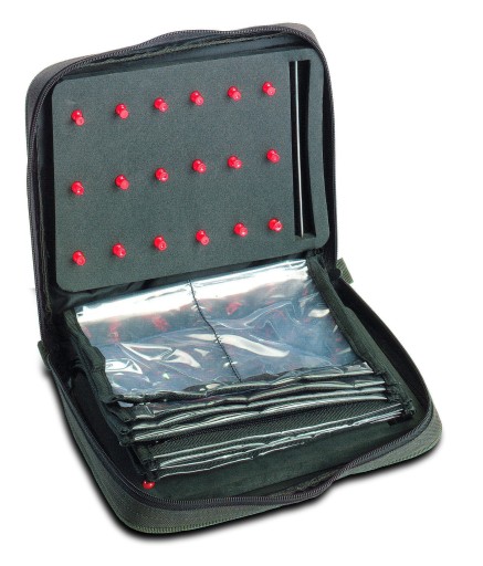 Wyposażony jest w 8 kieszonek na przypony i 2 przegrody na akcesoria. Dodatkowo zawiera 2 piankowe tablice, na których można zamocować 36 gotowych przyponów.