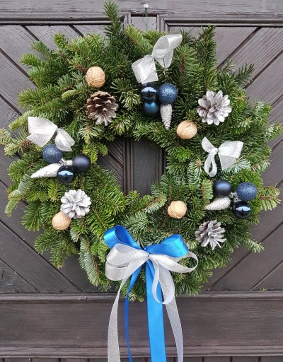 Wieniec wykonany z gałązek żywej jodły. Jako dekoracji użyto: niebieskie bombki, srebrne szyszki sosnowe (pomalowane sprayem), orzechy włoskie, srebrne kokardki oraz wstążki.