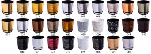 Od lewej: biały marmur; lustrzana; łososiowa, czarna błyszcząca, zielona błyszcząca, złoty błyszczący, czerwony błyszczący