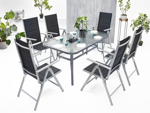 ZESTAW MEBLI OGRODOWYCH idealny do Twojego ogrodu. Stelaż został podwójnie lakierowany proszkowo, co idealnie przystosowuje ten produkt to zastosowania wewnątrz jak i na zewnątrz. Siedzisko krzesła oraz oparcie zostało zrobione z czarnego, elastycznego obicia tekstylnego tak, aby maksymalnie zwiększyć wygodę. Posiada ono dwa oparcia boczne. Użyte materiały nie wymagają częstej konserwacji, są odporne na warunki pogodowe i nie wymagają specjalnych środków do pielęgnacji. Nóżki są dodatkowo zaopatrzone w nakładki z tworzywa sztucznego. Stół posiada blat z przezroczystej hartowanej szyby o gr. 5 mm, z otworem na wstawienie parasola ogrodowego.